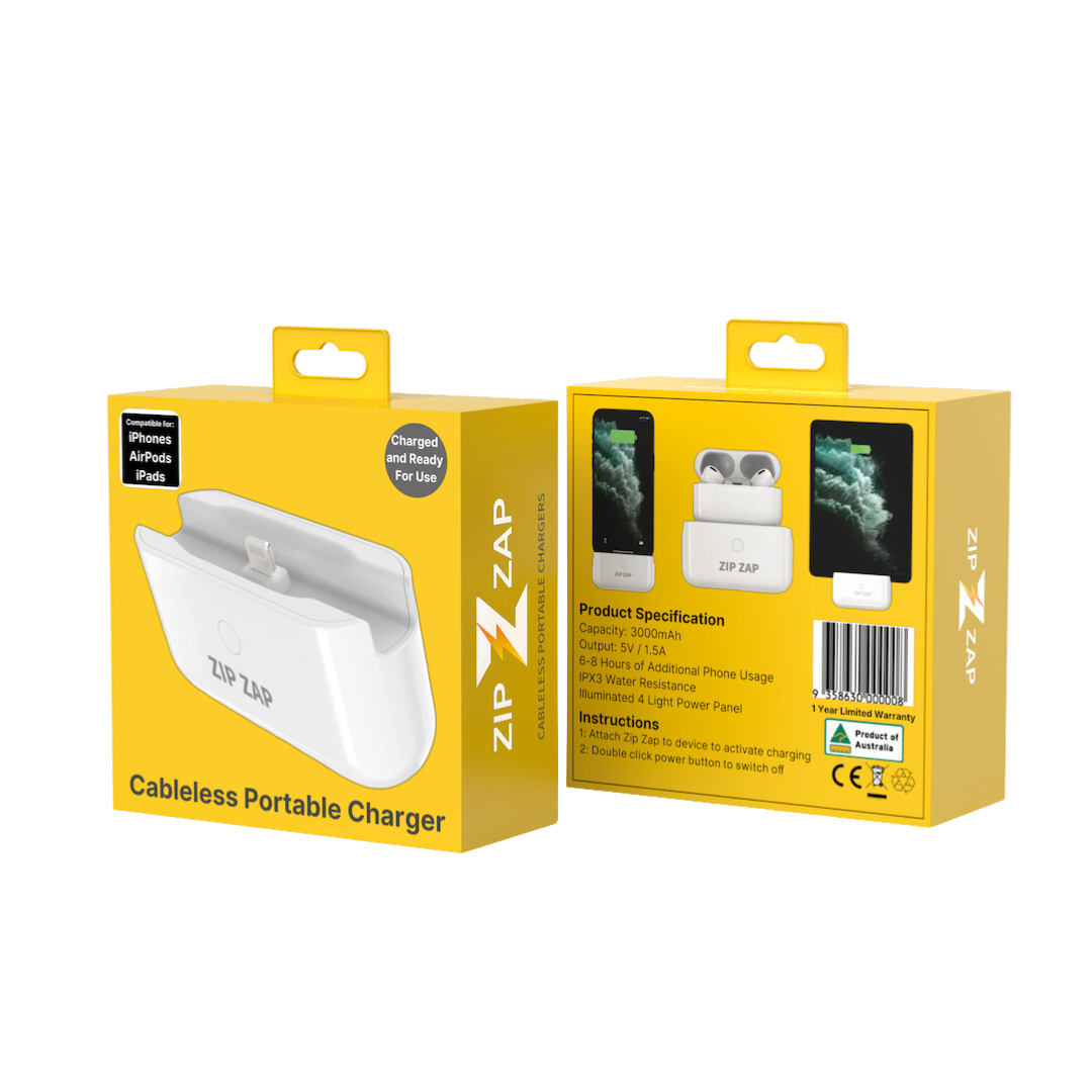 The Zip Zap Cableless Portable Charger is a revolutionary '3 in 1' charging solution that effortlessly powers your iPhone, AirPods, and Lightning connector iPads without the need for any cables. This world-first design features a patented, exclusive cable-free design that makes charging truly hassle-free. As seen on every major TV publication, including Sunrise, The Today Show, Channel Nine, Channel Seven to name a few, as well as featured in top news outlets like the Sydney Morning Herald, The Courier Mail, and the Daily Mail - the Zip Zap Cableless Portable Charger has quickly become recognised for its innovative and game-changing design.